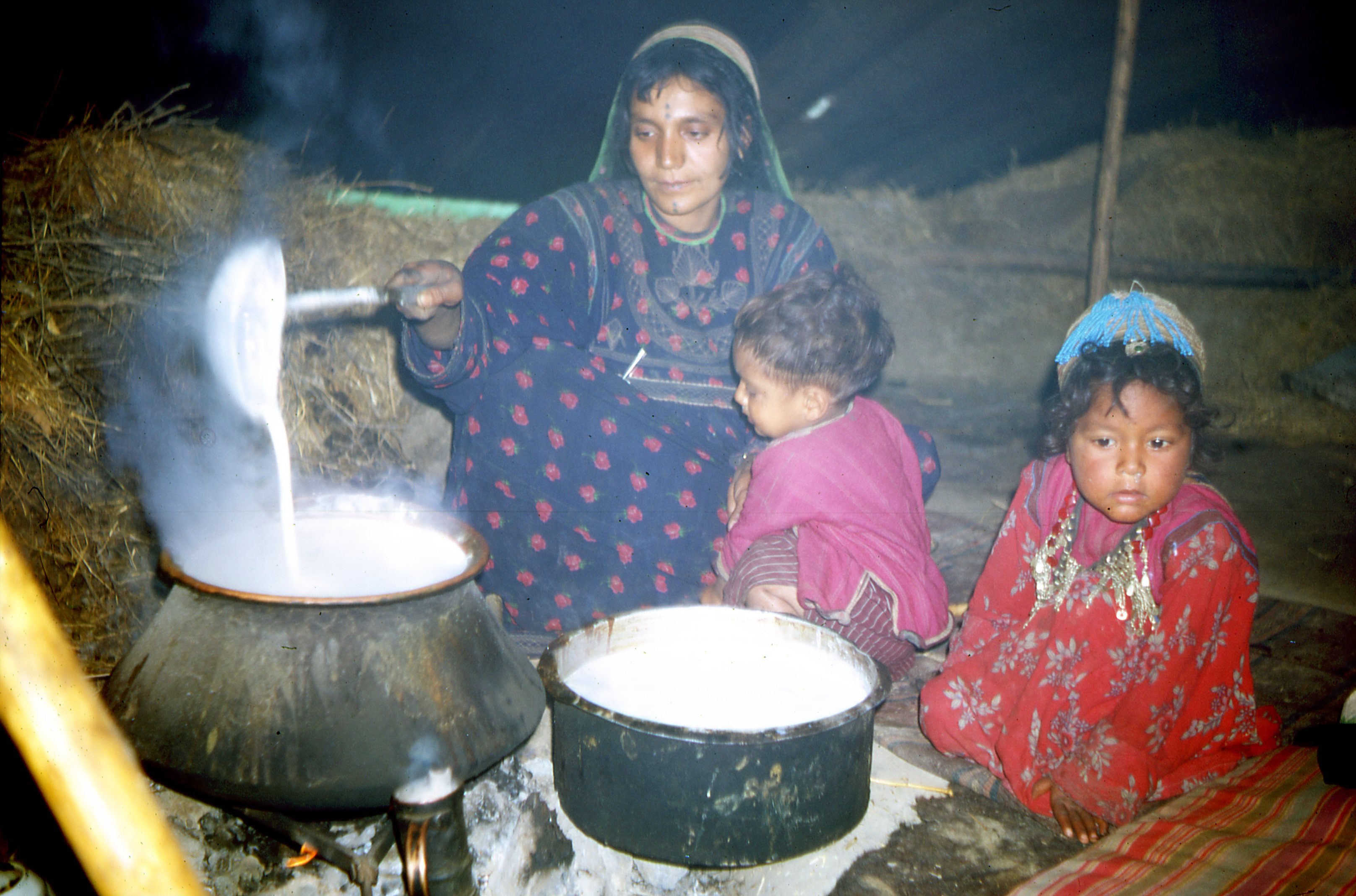My friend Badam managed her tent household while her husband, Khani-Agha, was away on military service. I spent many whole days with her and her three little children, Taj-Mahmad, Shiri and Lal-Mahmad. Here Badam is boiling up whey to form whey balls, krut, a prized foodstuff made into soup and stews in winter.